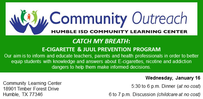 The next Community Outreach Event will be held this Wednesday, January 16, and is focused on the CATCH my Breath E-cigarette and Juul Prevention Program.