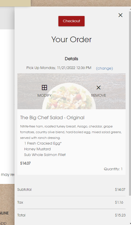 Ordering a Big Chef salad from Jason Deli in Humble for pickup online. With Salmon and egg is about $15.00