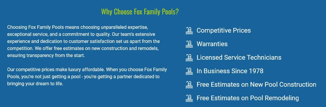 Fox Family Pools has a full time service staff and we have an authorized warranty center for everything we install. In new construction, remodeling, and repairs we use only the finest equipment and specification on each and every job.