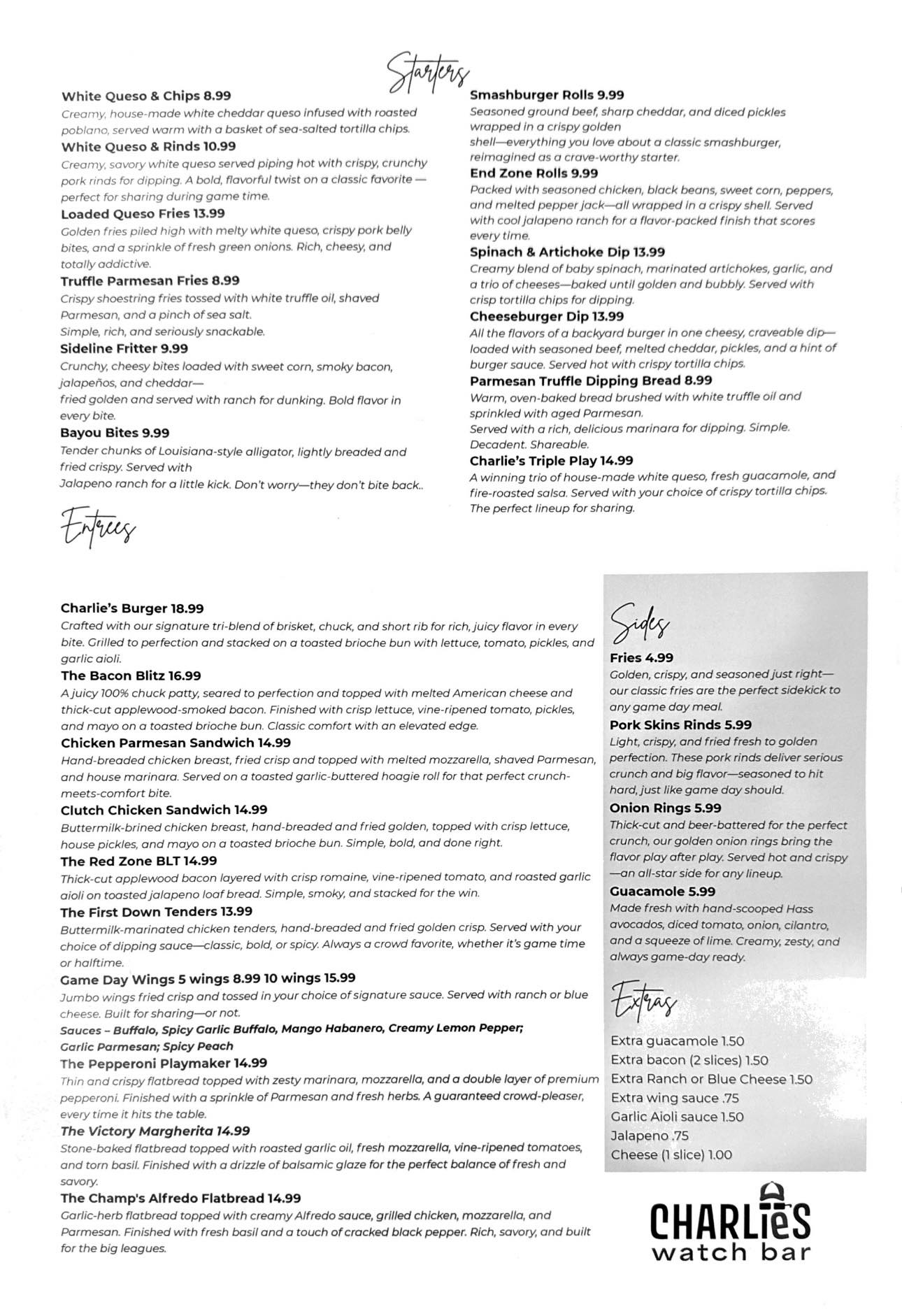 But we’re more than just a place to watch, we’re a place to gather. Our atmosphere is energetic but welcoming, perfect for families, die-hard sports fans, and casual viewers alike. Enjoy a curated lineup of local beers, handcrafted cocktails, and elevated bar food made from scratch. At Charlie’s, the game is only half the experience; the rest is about great food, great drinks, and even better company.