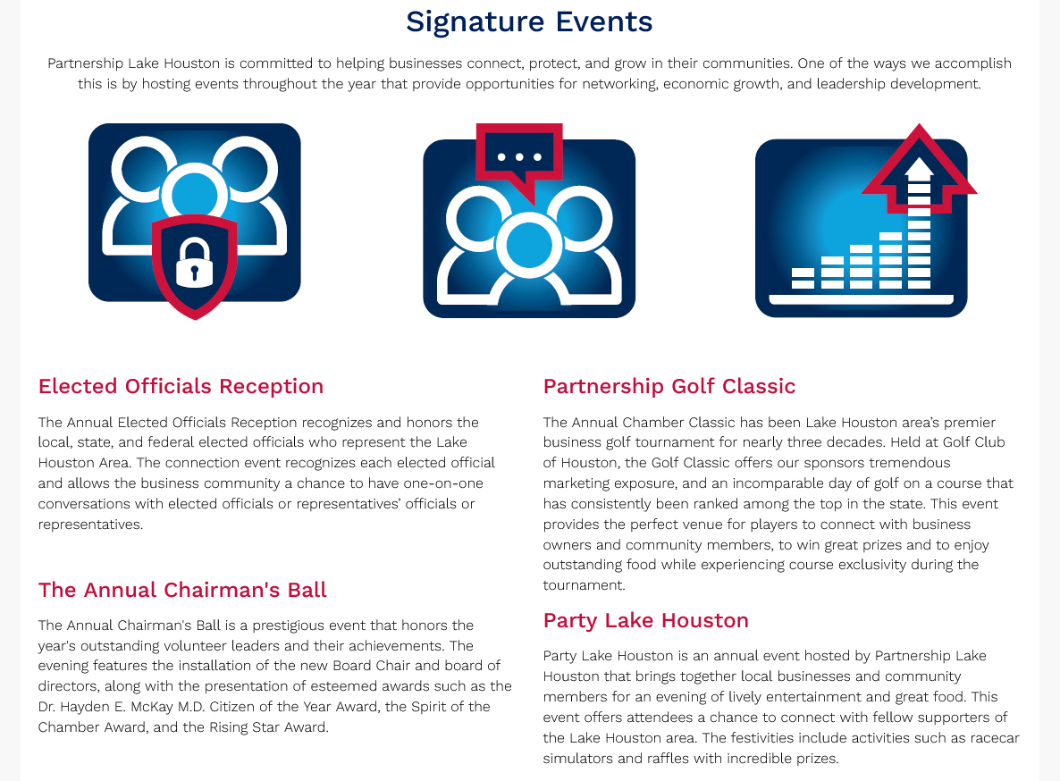 Promote business, enhance economic and community development, and serve as a catalyst for improving the overall quality of life in the Lake Houston area.