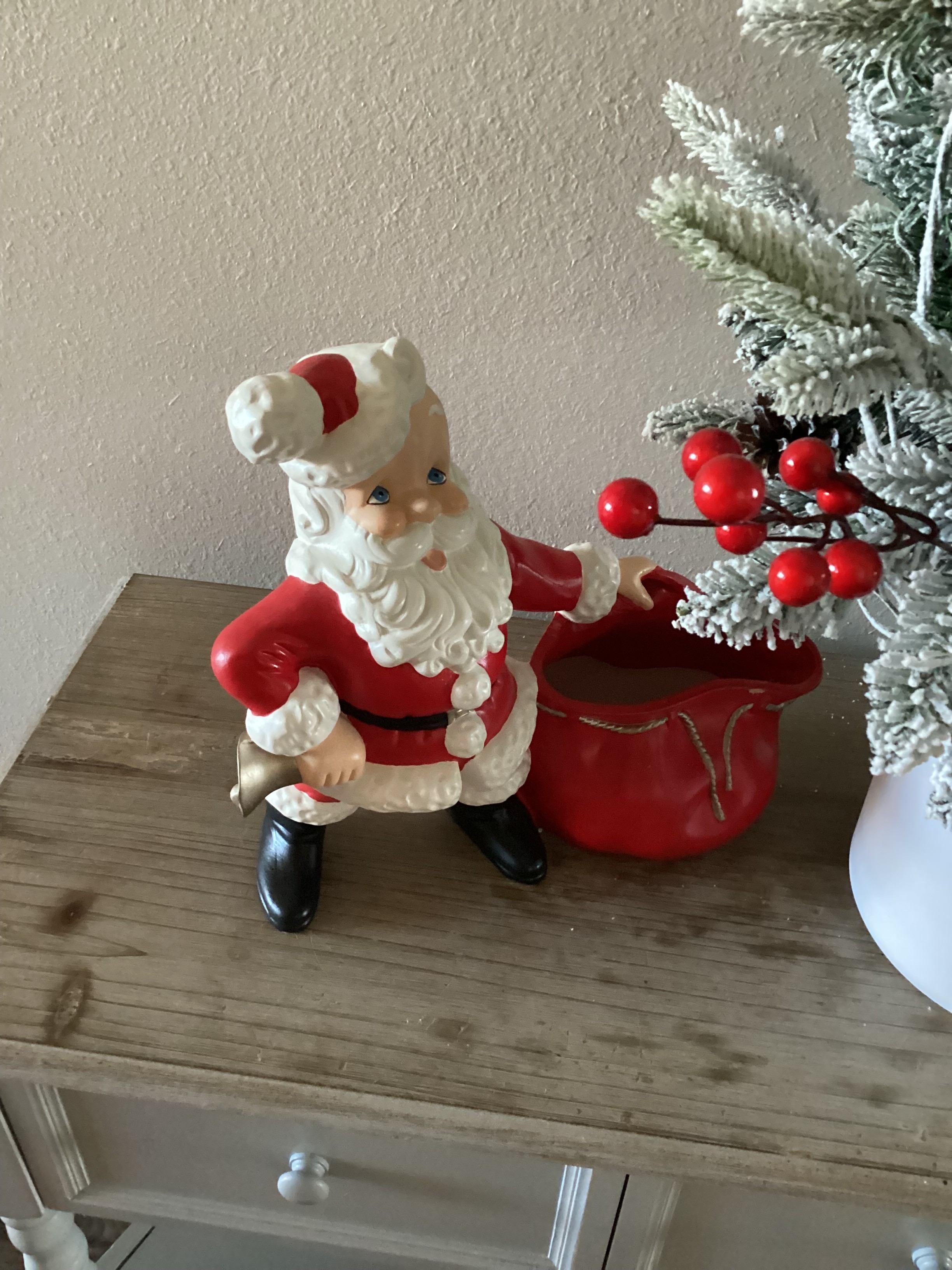 I have a couple, but they are packed away at my DD's house. Maybe next year I will get them to bring over. I have a large plastic poinsettia flower that my Mother always set in a swirl of "angle hair". From what I understood, she started decorating with it in the 1950's. I also have a Santa Claus bank that our next door neighbor gave me when I was about 7 years old. That thing is pretty old now, lol.