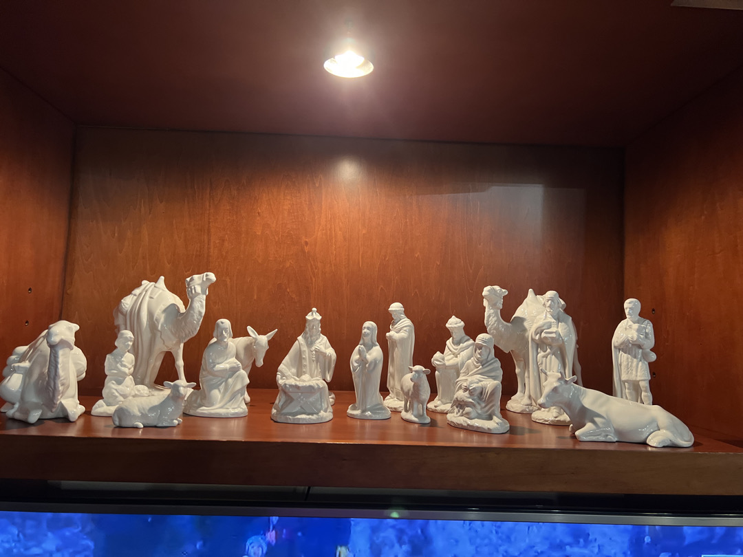 My mom was into ceramics back in the 70s, as I think everyone's moms were. lol. I put it out every year. She wrote 9/70 on the bottom of the bigger pieces. She made more, but this is the set I have.