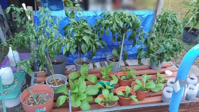 Peppers in the back, Mustard Greens in the front....