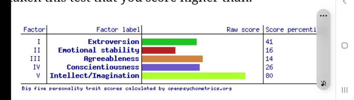@sandman : I scored more than you on agreeableness too. Not much but a little. But I must be a complete disaster because if I don't agree with someone, they should be scared of my dismal emotional stability. 😂