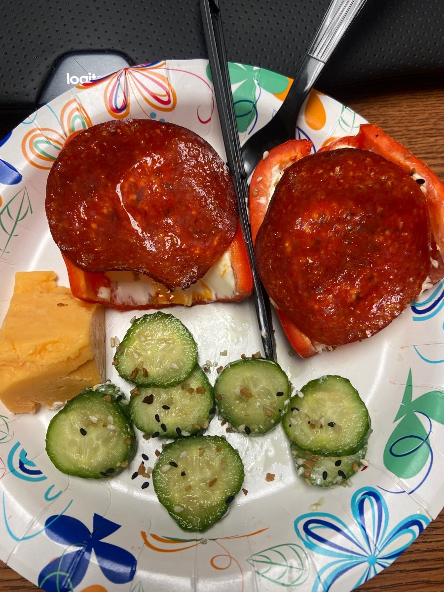 Pop cream cheese in the bell peppers top with bacon or pepperoni and throw in the air fryer.....................yummy