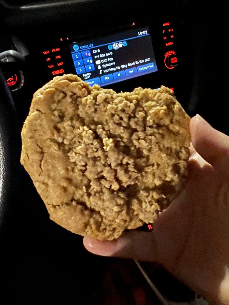"It's back - MOM'S RECIPE! 📝 This cookie is a long-standing family recipe from our co-founders! It's a warm oatmeal cookie packed with semi-sweet chocolate, toffee, and peanut butter chips and topped with a sprinkle of sea salt. Tag someone who needs this cookie!" I'm in double trouble! 😂