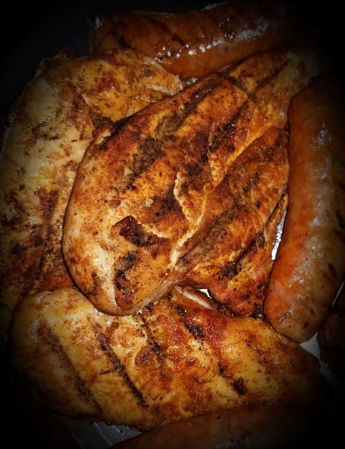 Got our smoked chicken off literally in the nick of time! My backup for tomorrow depending on the weather...if too rainy to grill, gonna chop up finely and make smoked chicken sour cream enchiladas with all the sides! 😀