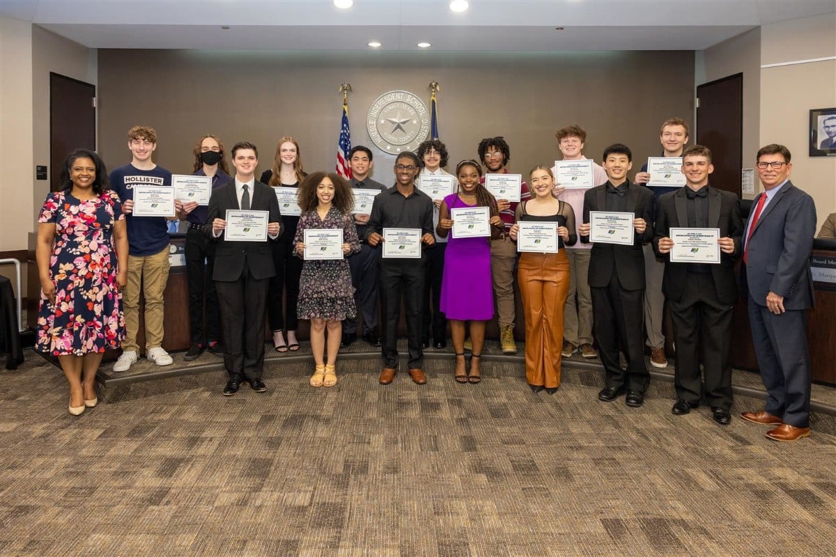 Pictured from left to right: Humble ISD School Board President Martina Dixon, Jacob Casilio (AHS), Bonzja Achtermann (AHS), Jackson Bowman (SCHS), Sarah Squires (AHS), Kayla Cistrunk (SCHS), Zachary Argomido (AHS), Khye Colbert (SCHS), Andres Herrera (HHS), Shelby Dotson (SCHS), Jordan Stairs (HHS), Sofia Plata (SCHS), Aaron Hatcher (KHS), Thomas Feng (SCHS), Slava Tchoubko (KHS), Zachary Houlton (SCHS) and Humble ISD Deputy Superintendent Dr. Roger Brown. Not pictured is Stanford Smith (SCHS) and Ennis Watt (KHS).