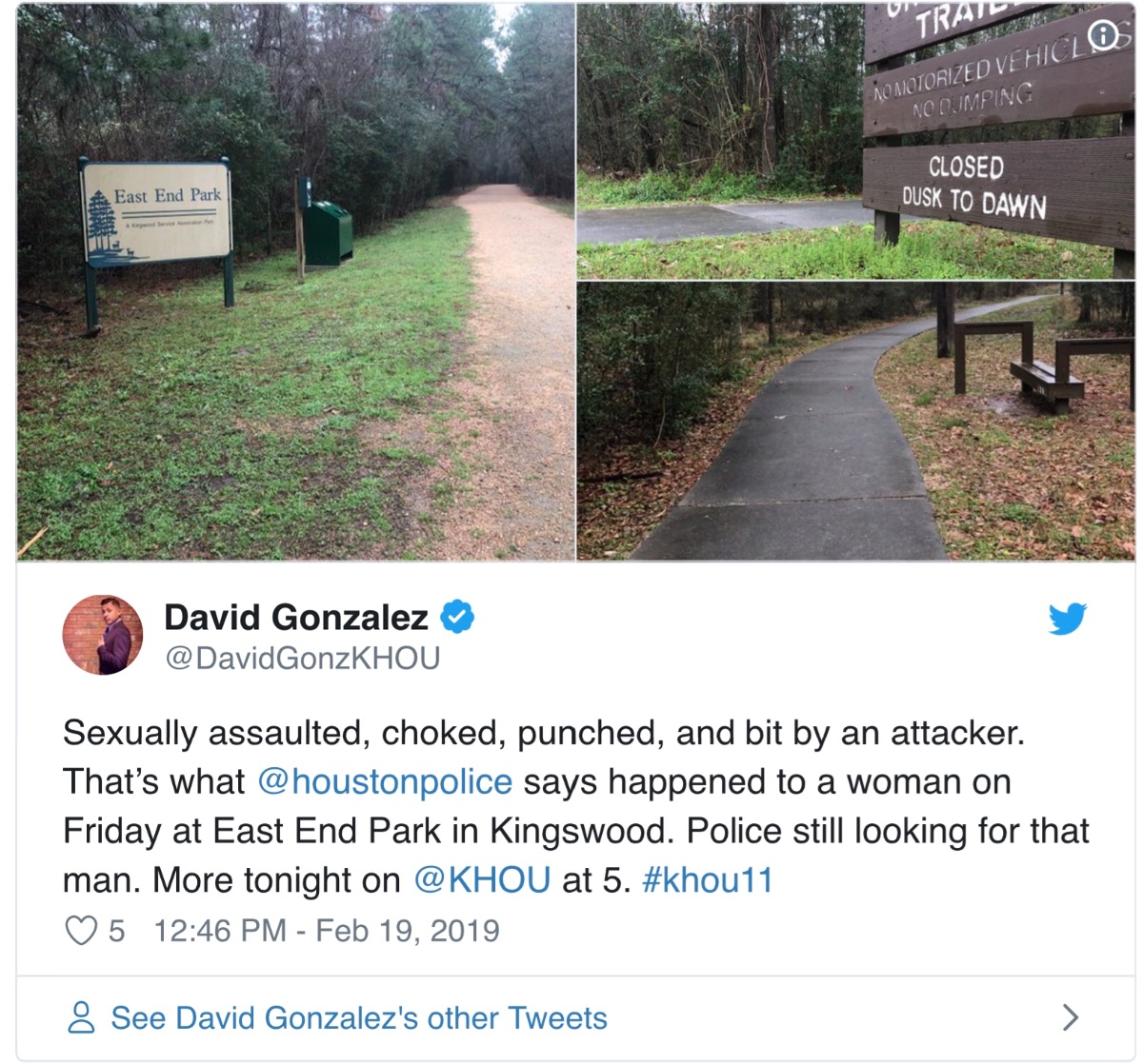 According to information gathered from Houston Police, an adult female has reported a sexual assault to authorities after being attacked by a man in East End Park (6400 Kingwood Dr) on Friday, February 15.