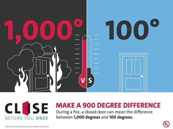 Research has shown that a closed door can mean the difference between 1,000 degrees and 100 degrees in the event of a fire - that's a 900 degree difference! A closed door can also keep carbon monoxide levels at 1,000 PPM verses 10,000 PPM when a door is left open.