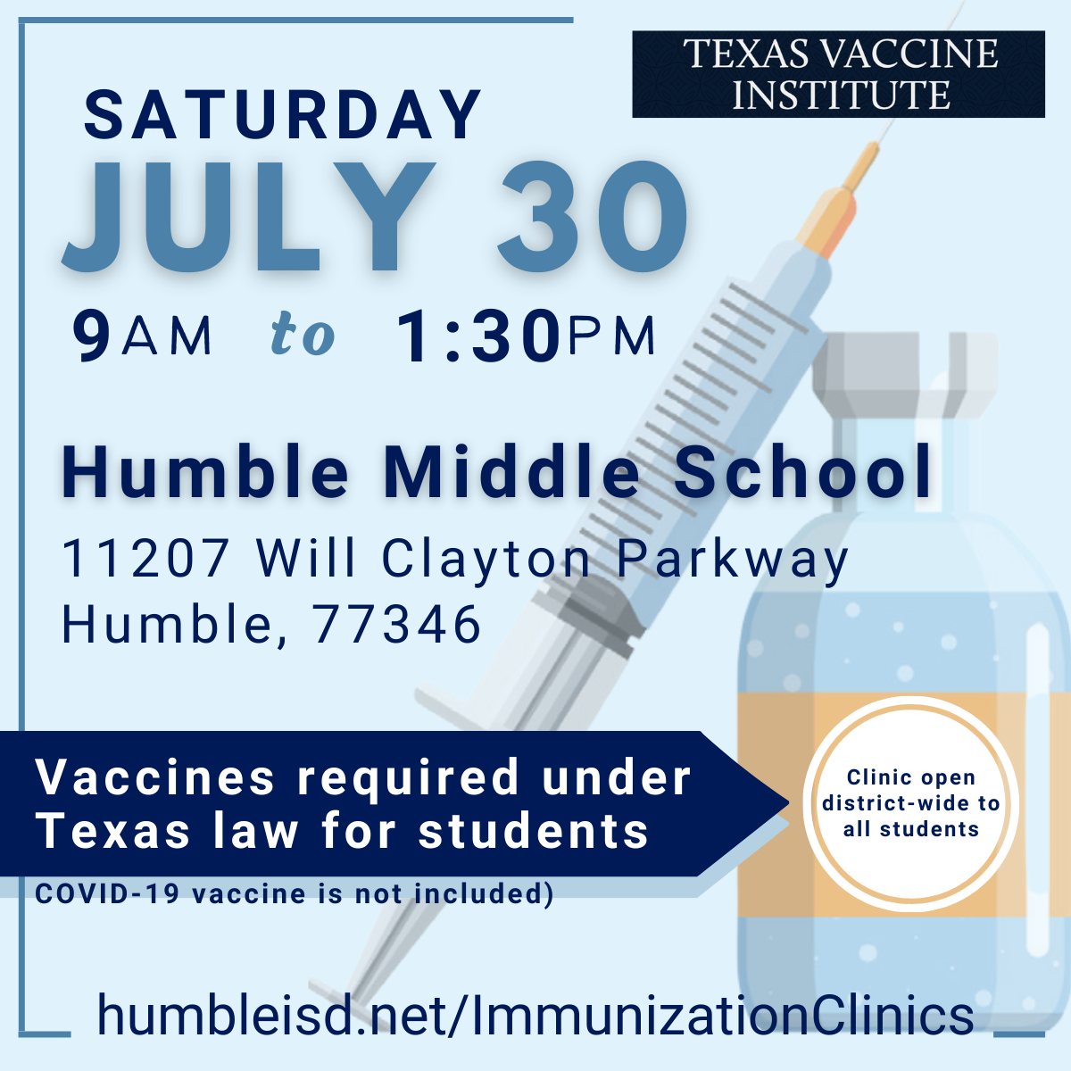 The following clinics will be open during 7th grade middle school camps; however, any Humble ISD student can come to the clinics for immunizations: