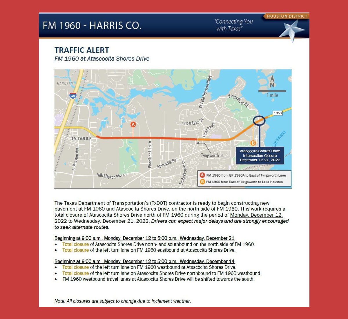 This work requires a total closure of Atascocita Shores Drive north of FM 1960 during the period of Monday, December 12, 2022 to Wednesday, December 21, 2022. Drivers can expect major delays and are strongly encouraged to seek alternate routes.