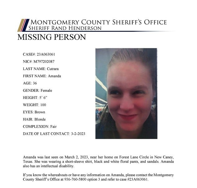 Amanda Cutrara was last seen on March 2, 2023, near her home on Forest Lane Circle in New Caney, Texas. She was wearing a short-sleeve shirt, black and white floral pants, and sandals. Amanda also has an intellectual disability.