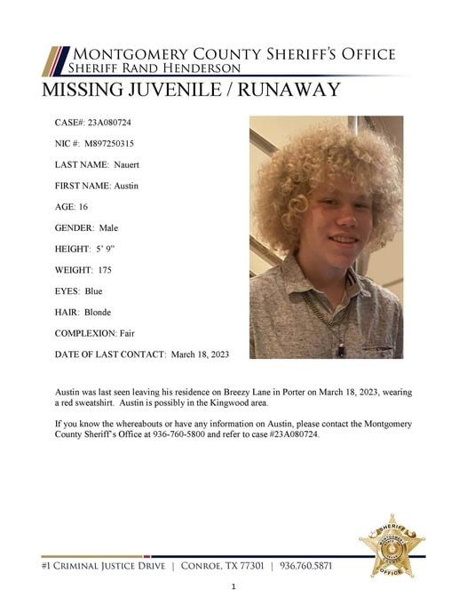 Austin was last seen leaving his residence on Breezy Lane in Porter on March 18, 2023, wearing a red sweatshirt. Austin is possibly in the Kingwood area.