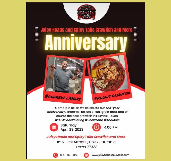 Atascocita, Texas - Juicy Heads and Spicy Tails Crawfish and More LLC, a popular seafood restaurant located in Humble, is celebrating its one-year anniversary on April 29th. The restaurant has become a favorite among locals and visitors alike due to its Cajun style seafood and Louisiana style crawfish.