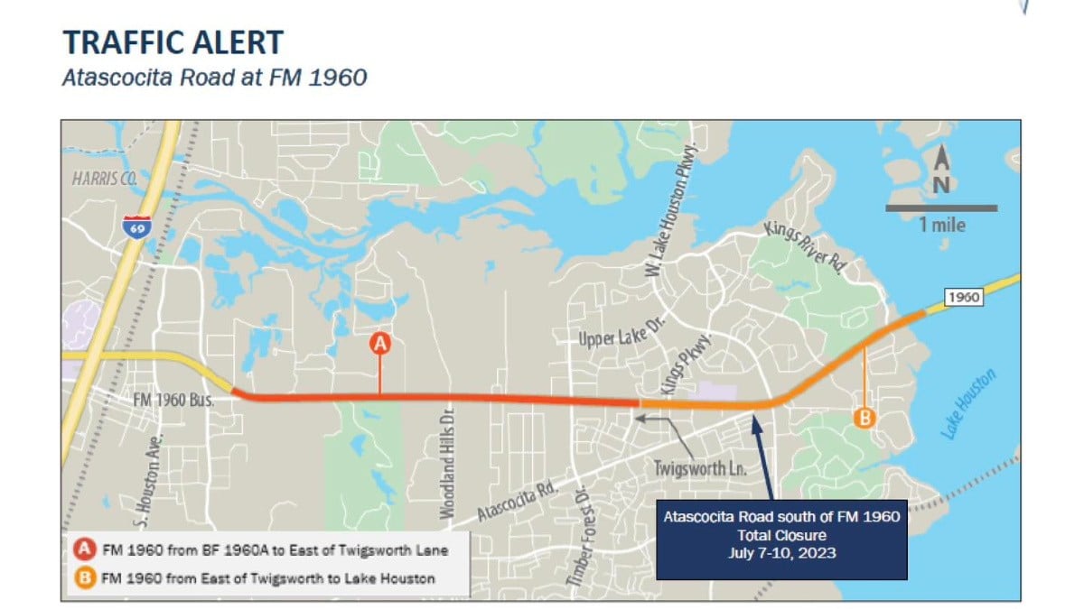 Here’s the latest update that we’ve received regarding details on an upcoming lane closure beginning on July 7-10, 2023 requiring the closure of Atascocita Rd near FM1960. More details below: