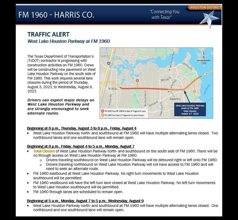 The Texas Department of Transportation's (TxDOT) contractor is progressing with construction activities on FM 1960. Crews will be constructing new pavement on West Lake Houston Parkway on the south side of FM 1960. This work requires several lane closures during the period of Thursday, August 3, 2023, to Wednesday, August 9, 2023.