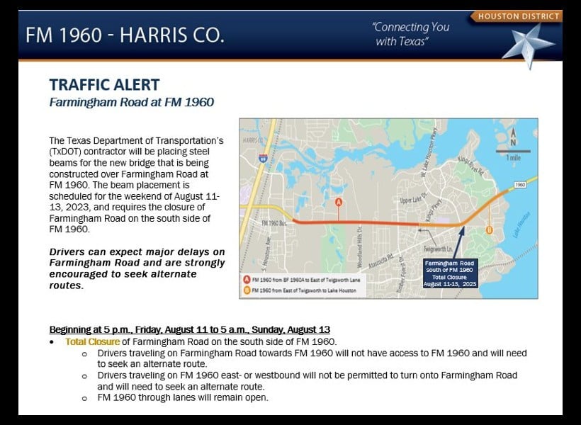 The Texas Department of Transportation’s (TxDOT) contractor will be placing steel beams for the new bridge that is being constructed over Farmingham Road at FM 1960. The beam placement is scheduled for the weekend of August 11-13, 2023, and requires the closure of Farmingham Road on the south side of FM 1960.