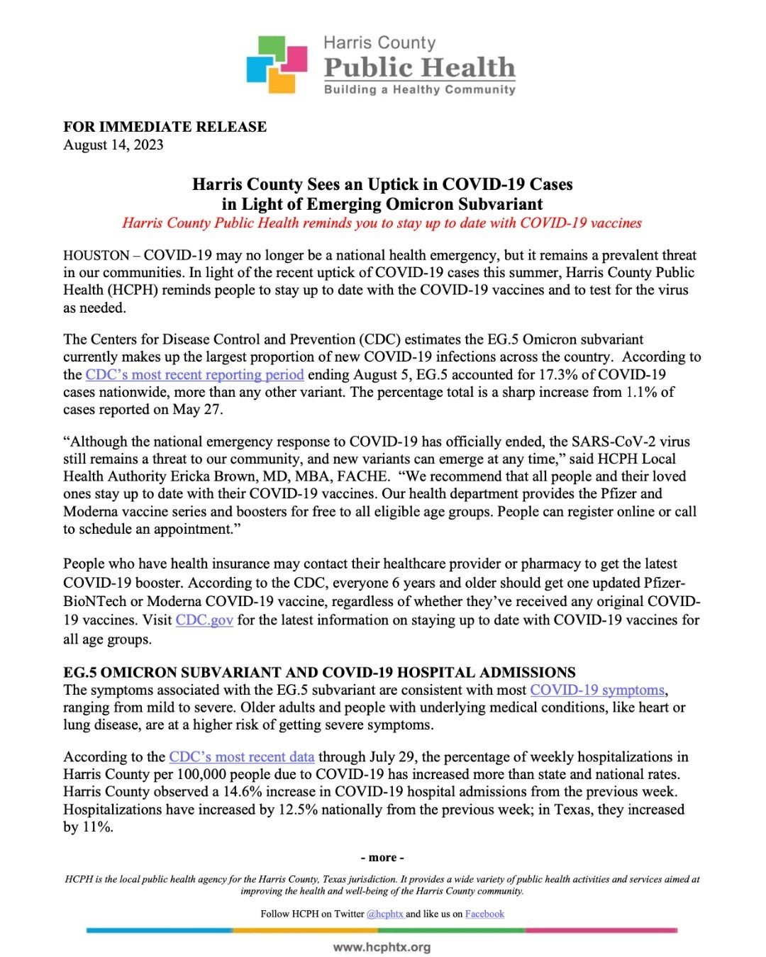 Local Topic Stay Informed: Harris County Sees Increase in COVID-19 Cases