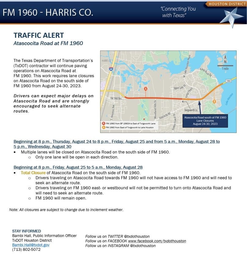 - Drivers traveling on FM 1960 east- or westbound will not be permitted to turn onto Atascocita Road and will need to seek an alternate route.