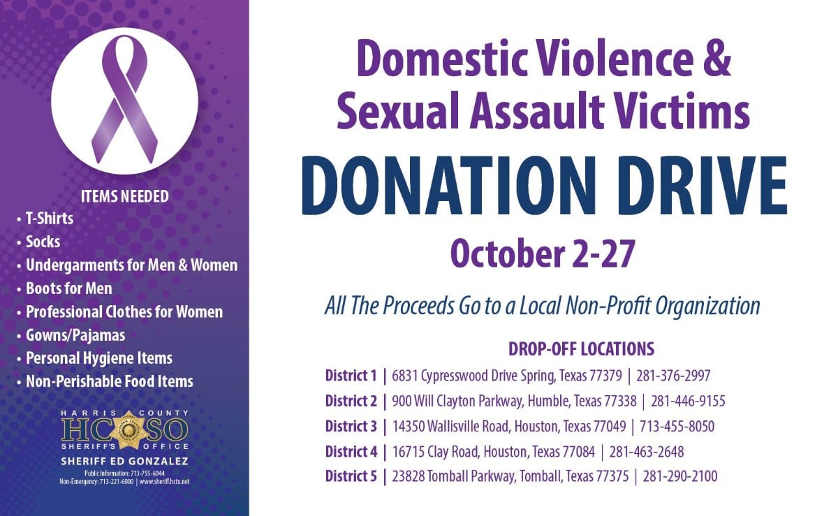 The Harris County Sheriff's Office is accepting donations for local non-profit organizations to assist domestic violence and sexual assault victims. Starting October 2 through October 27, you can drop off your donations at our five drop-off locations.