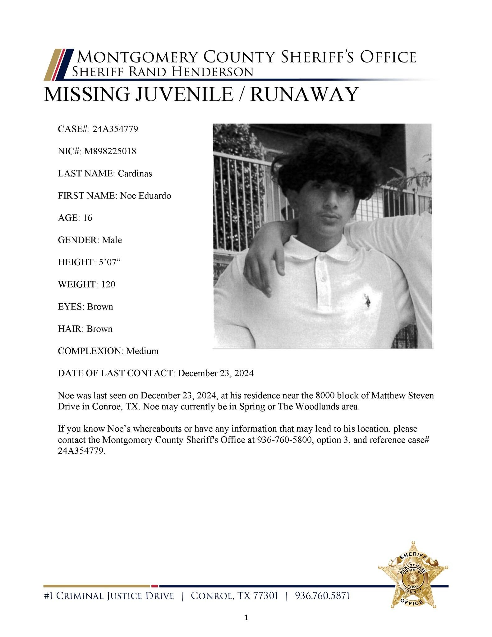 MCTXSheriff Searches for Missing Juvenile/Runaway - Noe Cardinas