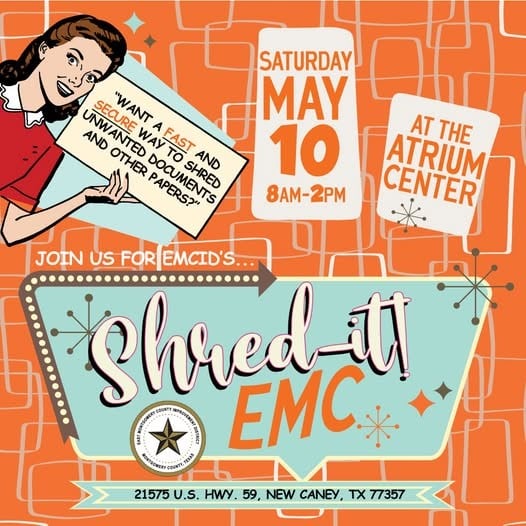 EMCID's Shred It EMC is just around the corner on Saturday, May 10, from 8 a.m. – 2 p.m. Gather your unwanted paper to shred and bring it to the Atrium Center parking lot at 21575 Hwy. 59 in New Caney. This is a FREE event for the community provided by the East Montgomery County Improvement District.