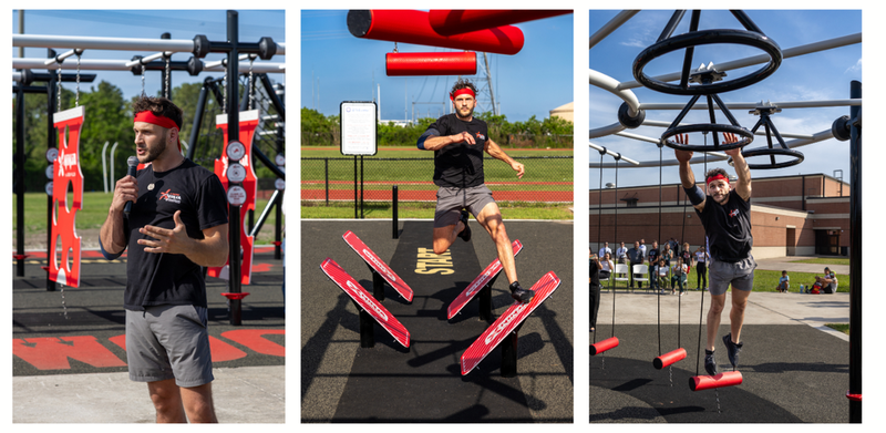 A highlight of the event was a special appearance by Adam Rayl, a seven-time finalist on American Ninja Warrior. Rayl made remarks, provided coaching as students tested the new course, and even joined in a head-to-head challenge with Woodcreek Math teacher Mr. Wilbert Edwards.
