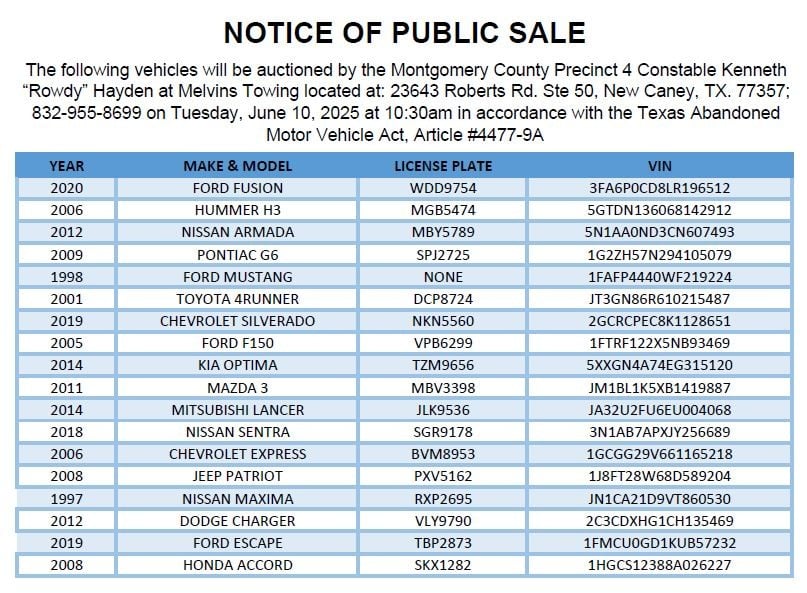 NOTICE OF PUBLIC SALE - The following vehicles will be auctioned by the Montgomery County Precinct 4 Constable Kenneth