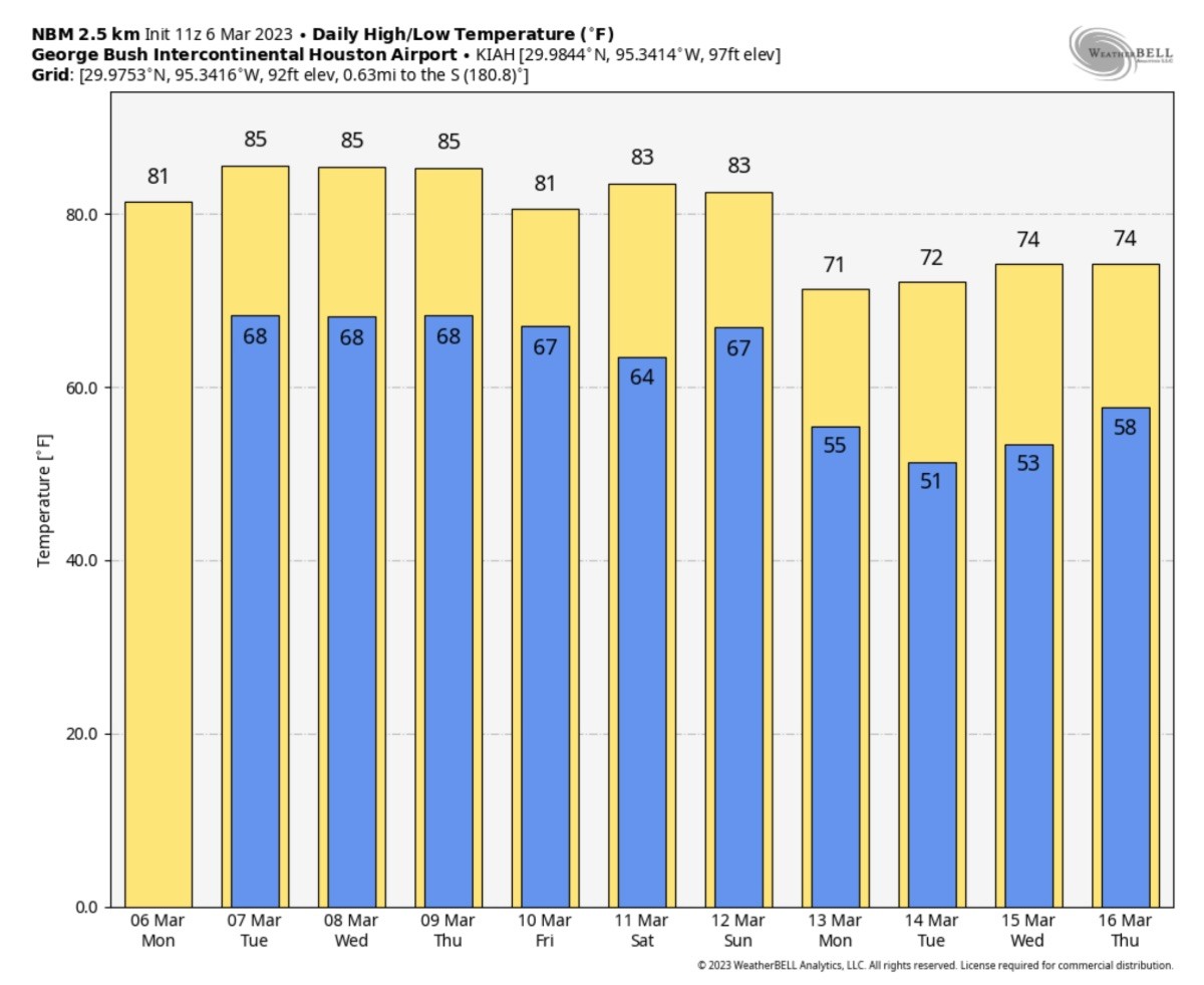 Another cold front will move through the Southeast Texas late Sunday and Monday, but the coldest air will stay much farther east. We could see some cooler mornings in the upper 40s and 50s by Monday, Tuesday, and Wednesday, but afternoon temperatures should stay at least in the 70s for highs.